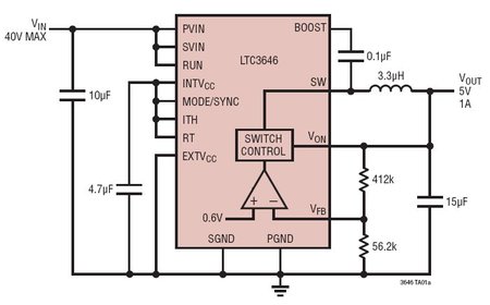 標(biāo)準(zhǔn)的LTC3646提供2.0V至30V的輸出范圍,而LTC3646-1提供0.6V至15V的輸出。兩種版本都提供一些附加功能,包括內(nèi)部軟啟動(dòng)、內(nèi)部補(bǔ)償和堅(jiān)固的短路保護(hù)。并廣泛用于負(fù)載點(diǎn)電源,中間總線電源,汽車應(yīng)用等領(lǐng)域中。