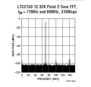 1,LTC2153-12 AC性能包括 67.6dB SNR 和 88dB 無(wú)寄生動(dòng)態(tài)范圍 (SFDR)。1.25GHz 輸入帶寬允ADC 以優(yōu)良性能對(duì)高頻率進(jìn)行欠采樣。延遲僅為 5 個(gè)時(shí)鐘周期。