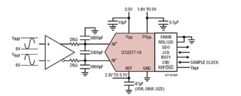 LTC2377-18具有一個(gè)高速SPI兼容的串行接口,支持1.8V,2.5V,3.3V和5V邏輯,同時(shí)還擁有一種菊花鏈模式。500ksps的吞吐量快速和無(wú)周期延遲使得LTC2377-18非常適合于多種高速應(yīng)用。從而緩解了外部定時(shí)方面的考慮。內(nèi)部振蕩器設(shè)置的轉(zhuǎn)換時(shí)間, LTC2377-18自動(dòng)斷電之間的轉(zhuǎn)換,從而降低功耗與采樣率的尺度。具有一個(gè)±VREF的全差分輸入范圍從5.1V VREF. LTC2377-18消耗只有6.8MW,并實(shí)現(xiàn)了±1.75LSB INL(最大值),與102分貝信噪比18位無(wú)丟失碼。 LTC2377-18自動(dòng)斷電之間的轉(zhuǎn)換,從而降低功耗與采樣率的尺度。支持2.5V,3.3V和5V邏輯。 500ksps的吞吐量快速和無(wú)周期延遲使得LTC2377-18非常適合于多種高速應(yīng)用。內(nèi)部振蕩器設(shè)置的轉(zhuǎn)換時(shí)間,從而緩解了外部定時(shí)方面的考慮。滿量程輸入范圍是4.5V,從一個(gè)單一的5.5V電源供電驅(qū)動(dòng)放大器提供足夠的凈空高度。