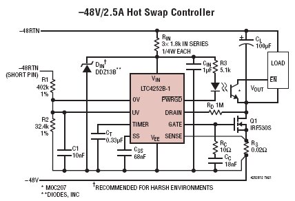 LTC4252C-1主要應(yīng)用范圍包括:帶電電路板插入、電子電路斷路器、-48V分布式電源系統(tǒng)、負(fù)電源控制、中心局交換、高可用性服務(wù)器以及ATCA(高級(jí)電信計(jì)算架構(gòu))領(lǐng)域中。主要的應(yīng)用圖如下: