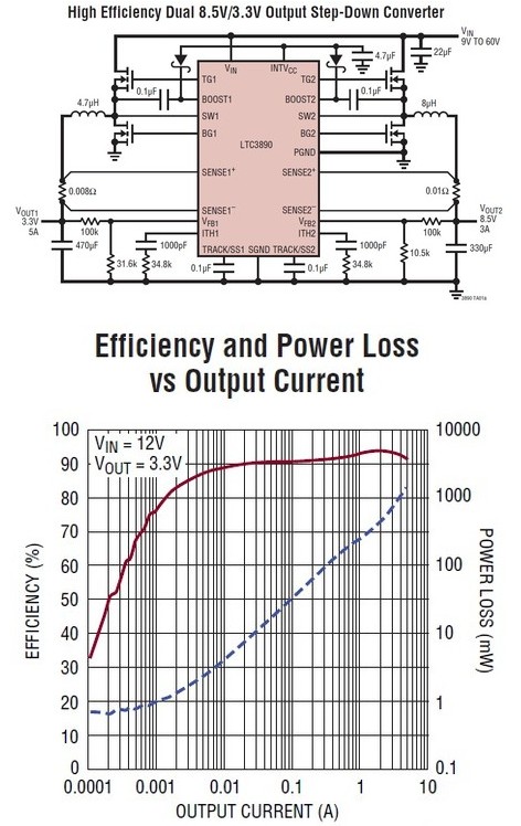 用于每個(gè)控制器的獨(dú)立 TRACK/SS 引腳負(fù)責(zé)在啟動(dòng)期間使輸出電壓斜坡上升。電流折返功能可限制短路情況下的 MOSFET 熱耗散。PLLIN/MODE 引腳用于在輕負(fù)載條件下選擇突發(fā)模式操作、脈沖跳躍模式或連續(xù)導(dǎo)通模式。如果需要采用有引線的版本 (28 引腳窄體 SSOP 封裝),請(qǐng)查閱 LTC3890-1 產(chǎn)品手冊(cè)。