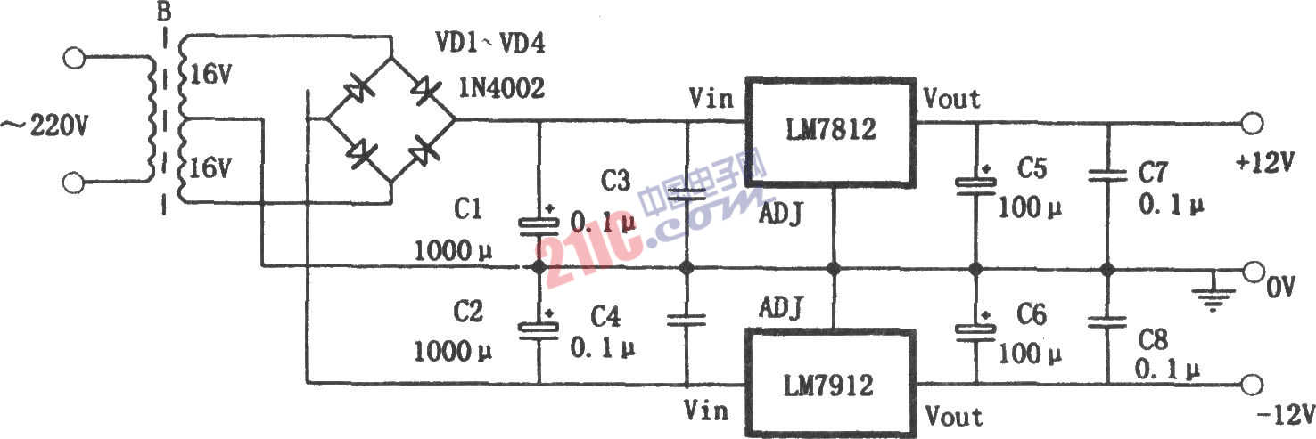 如圖所示為雙極性對(duì)稱穩(wěn)壓電源電路,它采用兩只三端穩(wěn)壓器,7812和7912構(gòu)成的簡(jiǎn)單實(shí)用的對(duì)稱型正負(fù)穩(wěn)壓電源。該電源輸出電壓為±12V,輸出電流最大為l.5A。對(duì)7812和7912的選擇,力求性能參數(shù)盡量對(duì)稱。正、負(fù)三端穩(wěn)壓器均要加裝合適的散熱器。