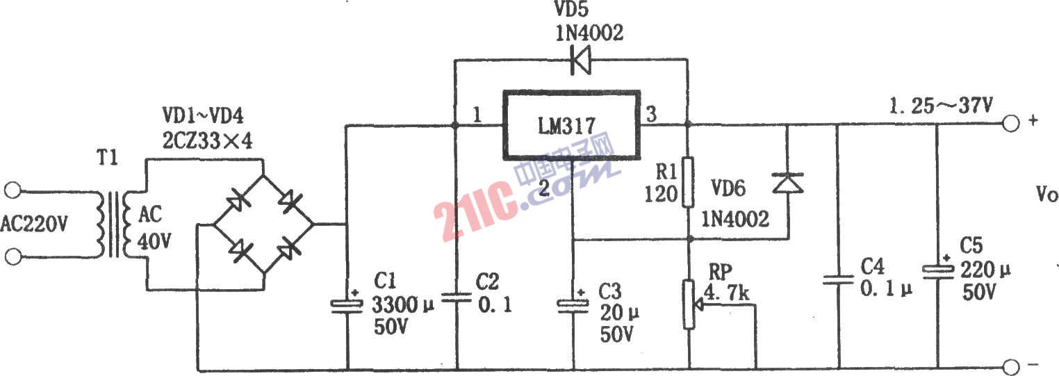 如圖所示為1.25~37V可調(diào)電源電路。它是可調(diào)式三端穩(wěn)壓器的典型應(yīng)用電路,特點(diǎn)是性能好、工作穩(wěn)定、體積小、制作安裝簡單方便,最大輸出電流為l.5A,輸出電壓在1.25~37V之間連續(xù)可調(diào)。它最適合做實(shí)驗(yàn)用電源。