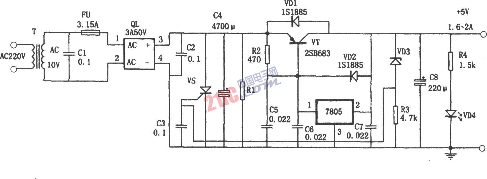 如圖所示為一種具有擴(kuò)流和過(guò)壓保護(hù)功能的+5V穩(wěn)壓電源電路,它采用在三端穩(wěn)壓器7805(最大電流1.5A)上跨接大功率三極管的方法擴(kuò)展電流,使本電源的輸出電流可達(dá)到2.5A左右。同時(shí)用5.6V穩(wěn)壓管、VD3、R3和Vs(可控硅)組成過(guò)壓保護(hù)電路。由于某種原因電源的輸出電壓達(dá)到或超過(guò)5.6V(VD3的穩(wěn)壓值)時(shí),VD3將被擊穿導(dǎo)通,可控硅Vs得到觸發(fā)電壓而導(dǎo)通,造成FU保險(xiǎn)絲快速熔斷。從而保護(hù)了負(fù)載。本電源可作為實(shí)驗(yàn)電源。