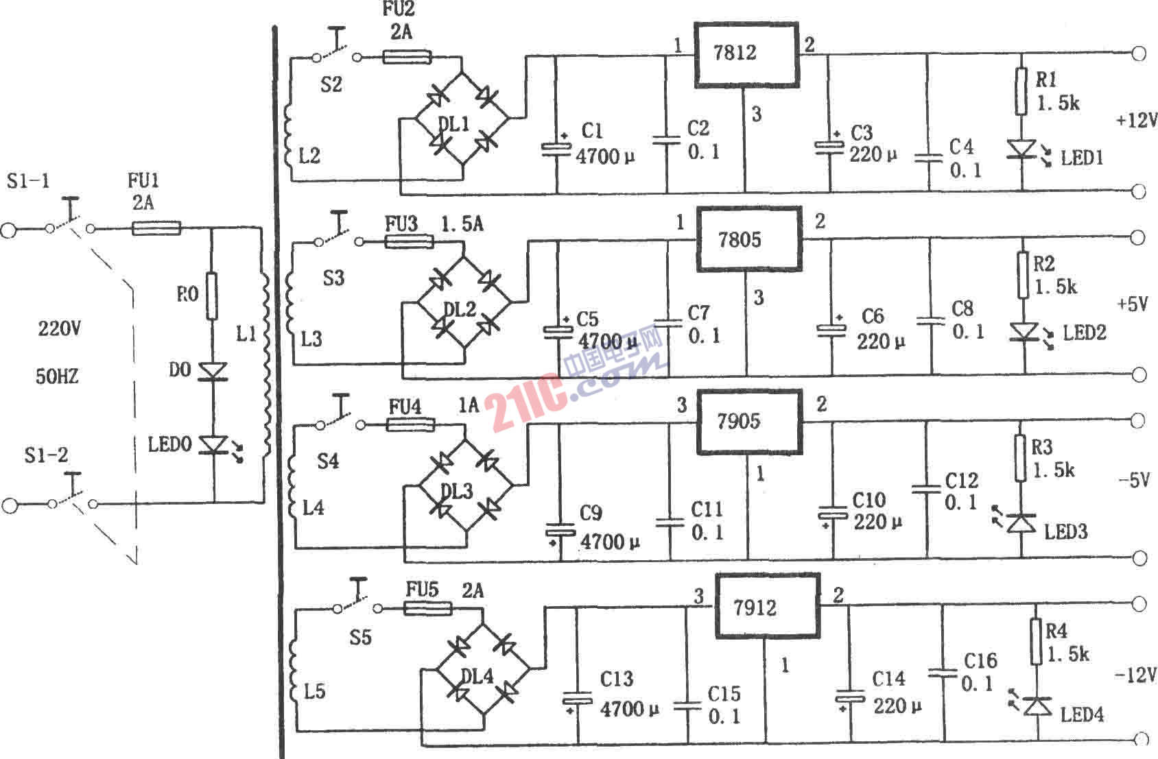 如圖所示為多路輸出的穩(wěn)壓電源電路。該電路利用變壓器的4個(gè)次級(jí)繞組和7812、7805、7905、7912分別提供+12V、+5V、-5V和-l2V 4組相互獨(dú)立的輸出電壓。每組輸出電壓都有單獨(dú)的開(kāi)關(guān)控制和輸出指示??勺鳛閷?shí)驗(yàn)用電源。