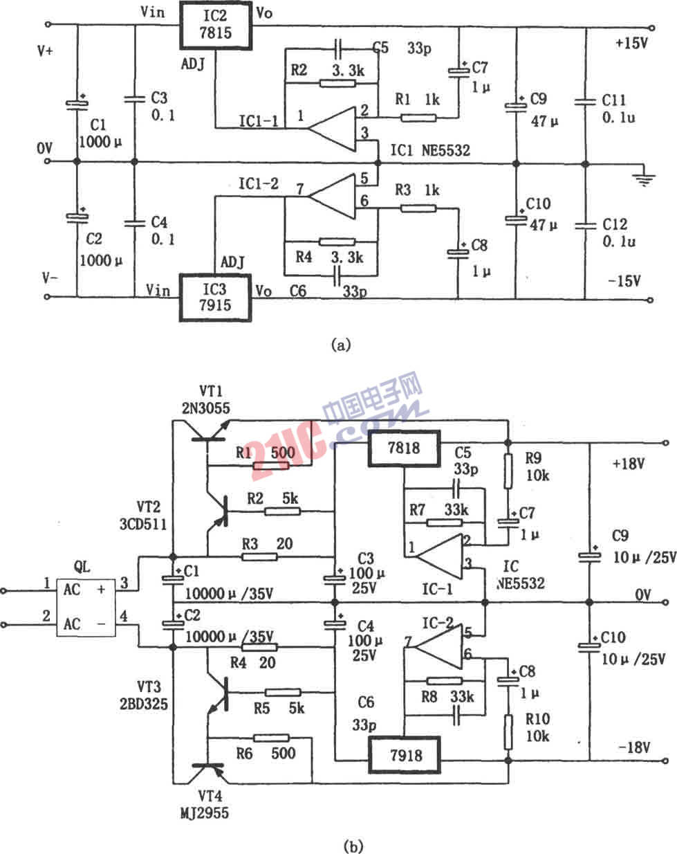 有源伺服電源是一種性能優(yōu)于蓄電池的電源,特別適合于音響設(shè)備。其高頻猝發(fā)信號(hào)適應(yīng)性和自身噪聲指標(biāo)特別好。圖(a)和圖(b)為兩種實(shí)用電路。前者適用于音響設(shè)備的前置放大電路。后者適用于功率放大電路。