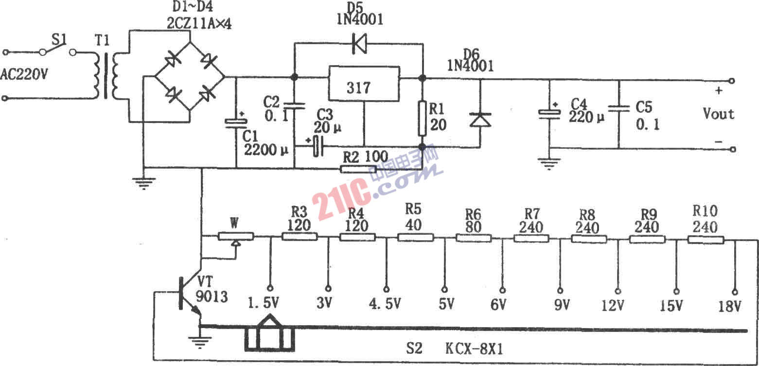 如圖所示為分擋可調直流穩(wěn)壓電源。本電源主要以可調式三端穩(wěn)壓器LM317為核心,在LM317的調整端接有可調電位器W、電阻R3~R10及九擋撥動開關S2和三極管VT,通過調節(jié)S2,在輸出端可得到固定的9擋不同的輸出電壓。三極管VT的作用是防止S2在撥動中出現(xiàn)暫時斷開或接觸不良,導致輸出電壓過高而損壞負載。R3~R10的阻值僅供參考。