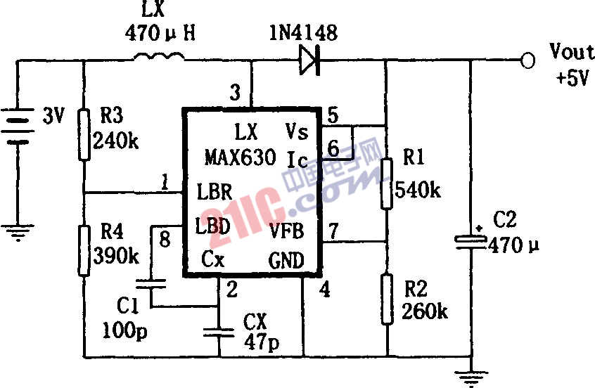 如圖是利用MAX630的低電池電壓檢測功能構(gòu)成的低電壓頻率偏移升壓變換電源。其特點(diǎn)是當(dāng)電池電壓低于標(biāo)稱值(3V)很多時(shí)(降到2V),仍能在輸出端高效率(85%)地提供40mA,5V的直流電壓。其過程是電池電壓的下降,引起MAX630 1腳電壓(由R3和R4對(duì)電池電壓分壓而得到)也下降,當(dāng)下降到低于電池電壓檢測比較器的門限電壓(1.31V)時(shí),檢測輸出端(⑧腳)LBD變?yōu)榈碗娖?地電位),將C1與Cx并接在一起,從而降低MAX630內(nèi)部振蕩器的頻率。增加輸出功率,補(bǔ)償因電池電壓降低而輸出功率的不足,保持輸出功率不變。