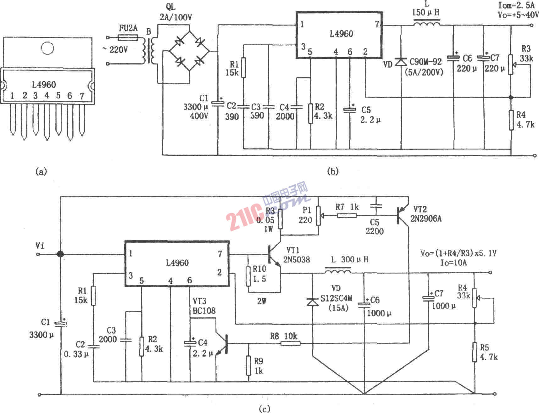 圖(c)所示為L(zhǎng)4960的電流擴(kuò)展電路。該電路采用外接大功率三極管的方法。將輸出電流擴(kuò)展為10A。并且設(shè)置了由VT2、VT3以及R5、R6、R7、R8、R9等元件組成的過流保護(hù)電路,當(dāng)輸出電流大于10A時(shí),保護(hù)電路動(dòng)作,將L4960的⑥腳電位鉗位到0V,關(guān)閉PWM比較器,終止電流的輸出。