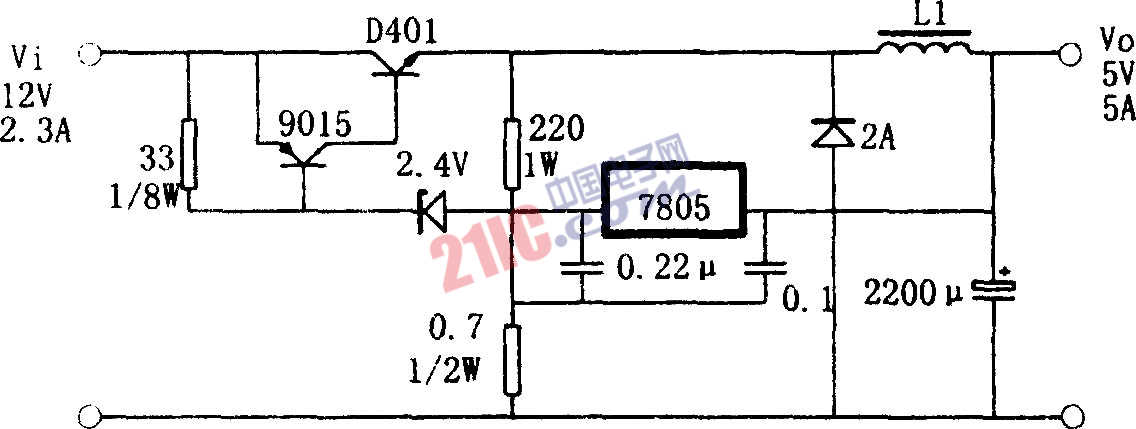 如圖所示為用三端穩(wěn)壓器制作的開關(guān)型穩(wěn)壓電源的具體電路。其工作原理可以通過等效電路圖來理解。由于某種原因,輸出電壓V0略有下降,其在R5和R6上的分壓V3也隨之下降,經(jīng)VT3放大,Ic3減小,Ic2增大,即流過R1和VD1的電流增加,V1下降,導(dǎo)致Ic1增大,V4上升,V4經(jīng)R2和R3的分壓,V2也隨著上升,相對來說又致使V3下降……此過程是一個正反饋連鎖反應(yīng),最后結(jié)果VT1、VT2強(qiáng)烈導(dǎo)通,VT3截止,Ic1對L1及C1充電,逐漸使Vo上升,Vo的上升又將引起一系列正反饋連鎖反應(yīng),經(jīng)過很短時間,Vo便上升到使VT3導(dǎo)通,VT1、VT2截止。L1上存儲的電流通過負(fù)載及續(xù)流二極管VD2釋放,使V4下降至零。當(dāng)然Vo也慢慢下降直到第二次翻轉(zhuǎn),即完成自激振蕩的一個周期。整個電路周而復(fù)始地工作于開關(guān)狀態(tài)。