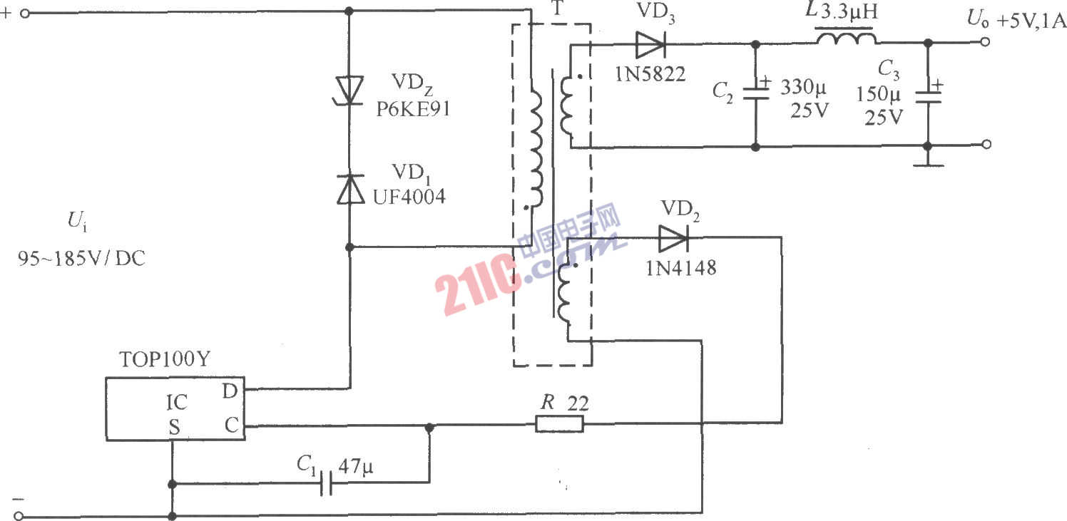 鉗位電路由瞬變電壓抑制二極管VDz(P6KE91)和超快恢復(fù)二極管VDl(UF4004)組成。次級(jí)電壓VD3、C2、L、C3整流濾波后,獲得+5V輸出。反饋線圈電壓通過VD2、R和Cl整流濾波后,加到TOPl00Y的控制端。Cl兼作控制環(huán)路的補(bǔ)償電容,并決定自動(dòng)重啟動(dòng)頻率。