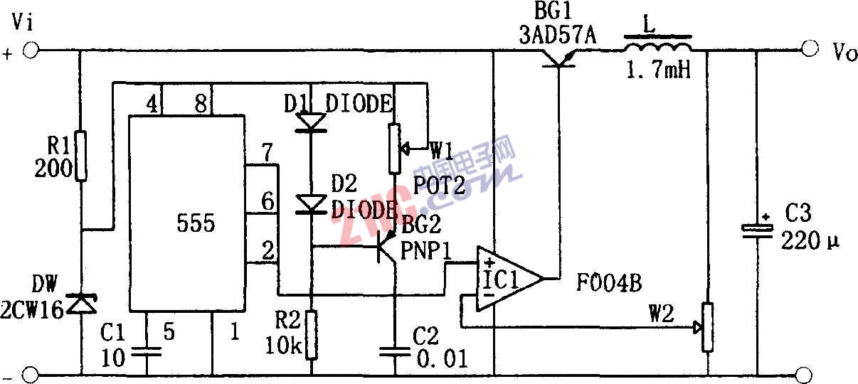 如圖所示為用555構(gòu)成的升壓型開關(guān)穩(wěn)壓電源電路。電路中,采用晶體管BG1作為開關(guān)調(diào)整管;運算放大器IC1構(gòu)成比較放大器;555時基電路接成無穩(wěn)態(tài)多諧振蕩器。振蕩器在C1上產(chǎn)生鋸齒波電壓(Vmin=1/3Vz,Vmax=2/3Vz,頻率由W1和C1確定)送至比較器IC1的同相輸入端,取樣電壓送至比較器的反相輸入端。IC1輸出矩形波形的占空比由取樣電壓控制,在輸出電壓為一穩(wěn)定值時,取樣電壓為1/3Vz和2/3Vz之間某一值。當某種原因使輸出電壓上升(或下降)時,取樣電壓隨之上升(或下降),使IC1輸出矩形波占空比減小(或增大),導(dǎo)通時間減短(或增加),輸出電壓下降(或上升),從而達到穩(wěn)定輸出電壓的目的。調(diào)整W,可控制輸出電壓的大小。