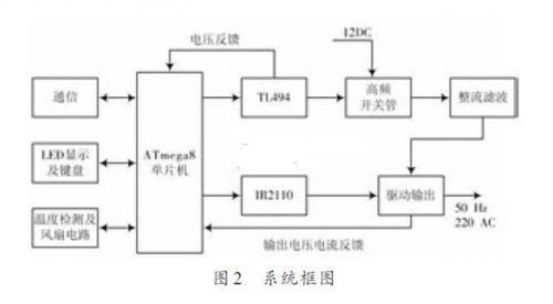 在以上列舉的三種逆變電源設(shè)計(jì)方案當(dāng)中,以二次逆變的正弦波逆變電源為佳。按照這種思路,早期的具體電路解決方案多采用PWM控制芯片如TL494,SG3524,SG3525A等,以固定的頻率去控制DC/DC和DC/AC部分的開關(guān)管,并采用修正電路對(duì)輸出的波形進(jìn)行修正,以期達(dá)到正弦波的要求。但這種純PWM芯片控制的電路,對(duì)于元件的老化。發(fā)熱。受到干擾等情況無法自動(dòng)加以修正,或者修正能力差,往往使得在實(shí)際的應(yīng)用當(dāng)中經(jīng)常出現(xiàn)電路故障。隨著單片機(jī)技術(shù)的發(fā)展,設(shè)計(jì)人員不斷想將單片機(jī)引入到正弦逆變電源的控制當(dāng)中,但對(duì)于高頻部分的控制,低成本的單片機(jī)完成不了這個(gè)功能,高成本的單片機(jī)又會(huì)降低性價(jià)比,故本文提出了另外一種設(shè)計(jì)方案,就是采用低廉的ATmega8單片機(jī),配合TL494,IR2110和開關(guān)管,構(gòu)成一個(gè)體積小,成本低,控制能力強(qiáng)的正弦波逆變電源,其方框圖如圖2所示。