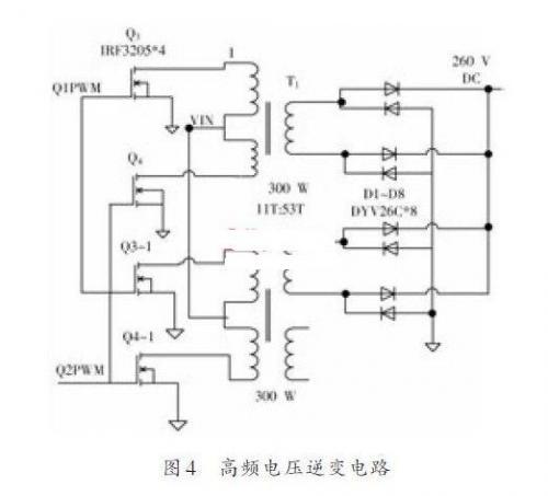 如圖4所示為高頻電壓逆變電路,由4只IRF3205管構(gòu)成全橋逆變電路,IRF3205采用先進(jìn)的工藝技術(shù)制造,具有極低的導(dǎo)通阻抗,加上具有快速的轉(zhuǎn)換速率和以堅(jiān)固耐用著稱的HEXFET設(shè)計(jì),使得IRF3205成為極其高效可靠的逆變管。從輸入端Q1PWM,Q2PWM輸入的高頻脈沖串控制這4個(gè)管兩兩導(dǎo)通,對(duì)VIN輸入的直流低壓進(jìn)行斬波,然后經(jīng)升壓變壓器后,逆變成高頻交流方波,此時(shí)流通的電流為磁化電流,所以選取Philips公司生產(chǎn)的BYV26C超快軟恢復(fù)二極管組成了全橋整流電路,該管子重復(fù)峰值電壓為600 V,正向?qū)娏鳛? A,其反向恢復(fù)時(shí)間30 ns,可以滿足電路的參數(shù)需求,整流后的電壓經(jīng)濾波電路后輸出直流電壓260 V,送往DC/AC逆變電路,另外260 VDC經(jīng)降壓處理后作為作為反饋信號(hào)輸入圖3中的VFB端,作為高頻逆變電壓的反饋信號(hào)。