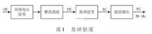 隨著高頻開關(guān)管技術(shù)的日趨成熟,逆變電源的電路設(shè)計(jì)趨向于先變壓,后變頻,即先將直流電壓轉(zhuǎn)為高頻交流電,再將高頻交流電轉(zhuǎn)換為50 Hz的正弦交流電源,其原理框圖如圖1所示。