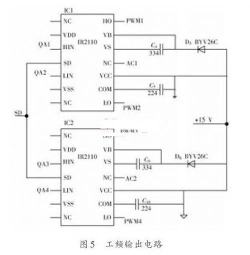 DC/AC變換輸出電路采用全橋逆變單相輸出,其驅(qū)動(dòng)輸入波形則由單片機(jī)輸出信號(hào)驅(qū)動(dòng)半橋驅(qū)動(dòng)器IR2110 輸出工頻驅(qū)動(dòng)信號(hào),通過單片機(jī)編程可調(diào)節(jié)該輸出驅(qū)動(dòng)波形的D<50%,保證逆變的驅(qū)動(dòng)方波有共同的死區(qū)時(shí)間.如圖5 所示,QA1~QA4 端分別接到單片機(jī)的PB1~PB4 引腳,由此引腳輸出信號(hào)驅(qū)動(dòng)兩片IR2110,分別從PWM1~PWM4輸出50 Hz的工頻信號(hào)去驅(qū)動(dòng)橋式逆變電路產(chǎn)生正弦波形。