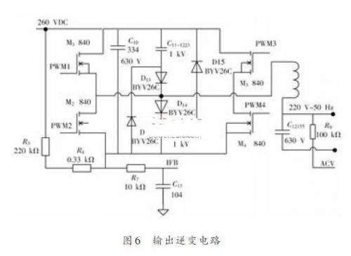 逆變正弦電壓輸出電路有兩種調(diào)制方式,一種為單極性調(diào)制方式,其特點(diǎn)是在一個(gè)開關(guān)周期內(nèi)兩只功率管以較高的開關(guān)頻率互補(bǔ)開關(guān),保證可以得到理想的正弦輸出電壓,另兩只功率管以較低的輸出電壓基波頻率工作,從而在很大程度上減小了開關(guān)損耗,但又不是固定其中一個(gè)橋臂始終為低頻(輸出基頻),另一個(gè)橋臂始終為高頻(載波頻率),而是每半個(gè)輸出電壓周期切換工作,即同一個(gè)橋臂在前半個(gè)周期工作在低頻,而在后半周則工作在高頻,這樣可以使兩個(gè)橋臂的功率管工作狀態(tài)均衡,對(duì)于選用同樣的功率管時(shí),使其使用壽命均衡,對(duì)增加可靠性有利.另一種為雙極性調(diào)制方式,其特點(diǎn)是4個(gè)功率管都工作在較高頻率(載波頻率),雖然能得到正弦輸出電壓波形,但其代價(jià)是產(chǎn)生了較大的開關(guān)損耗.如圖6所示,本文的逆變輸出電路采用了單極性調(diào)制方式,這樣可以提高波形的平滑度,增加電路的可靠性.圖6 中的PWM1~PWM2 分別接收來自圖5 的輸出驅(qū)動(dòng)信號(hào),驅(qū)動(dòng)由4個(gè)具有500 V耐壓值的IRF840開關(guān)管組成的橋式逆變電路,將260 VDC 逆變成220 V,50 Hz的交流電,經(jīng)LC 濾波后供給負(fù)載.圖6中的IFB端和ACV端,分別和為電流和電壓的采樣,送到單片機(jī)的PC4和PC5引腳進(jìn)行A/D轉(zhuǎn)換,再由單片機(jī)將轉(zhuǎn)換果用于功率計(jì)算和電路保護(hù)之用。