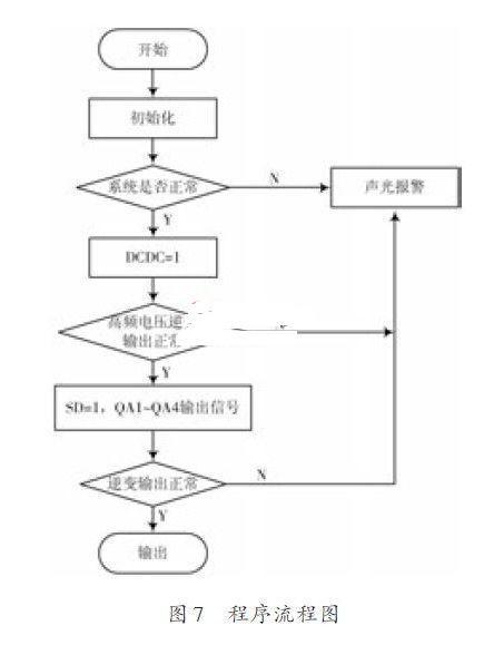 本文主要將它應(yīng)用于整個(gè)系統(tǒng)的信號(hào)驅(qū)動(dòng),溫度檢測(cè),風(fēng)扇控制,安全保護(hù),數(shù)據(jù)顯示等.ATmega8單片機(jī)分別采集來自系統(tǒng)電路的溫度、電流、電壓,并根據(jù)這三個(gè)參數(shù)的情況分別控制啟動(dòng)風(fēng)扇散熱,控制是否輸出報(bào)警信號(hào),控制SD 端和DCDC 端是否使系統(tǒng)處于保護(hù)狀態(tài),QA1~QA4則是輸出50 Hz的驅(qū)動(dòng)信號(hào),具體的編程控制如圖7所示.當(dāng)系統(tǒng)啟動(dòng)后,單片機(jī)先檢查系統(tǒng)的溫度環(huán)境是否正常,不正常則啟動(dòng)報(bào)警,并提示出錯(cuò)代碼,如果正常則啟動(dòng)高頻逆變電路工作,并檢測(cè)260 VDC是否正常,不正常則報(bào)警,正常則啟動(dòng)正弦逆變電路工作,并一直檢測(cè)輸出的電壓電流是否正常,正常則輸出,不正常則報(bào)警。