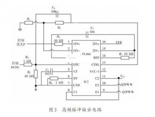 如圖3所示,由TL494組成了高頻脈沖輸出電路,該電路采用了性能優(yōu)良的脈寬調(diào)制控制器TL494集成塊。該集成塊內(nèi)含+5V基準(zhǔn)電源。誤差放大器,頻率可變鋸齒波振蕩器。PWM比較器。觸發(fā)器。輸出控制電路。輸出晶體管及死區(qū)時(shí)間控制電路等。該集成塊的第5~6腳分別外接了C1和R6組成了RC振蕩電路,可促使TL494輸出頻率為100引腳對(duì)圖中的DCDC端進(jìn)行控制。通過控制第4腳的死區(qū)時(shí)間控制端,可調(diào)節(jié)輸出信號(hào)的占空比在0~49%之間變化,從而控制輸出端Q1PWM~Q2PWM的輸出,而P端。VCC端和VFB端則分別接收來自負(fù)載,高頻逆變輸出電壓。輸入電壓的反饋信號(hào),與TL494內(nèi)部的電路組成過壓。過載保護(hù)電路,形成逆變器的第一級(jí)安全保護(hù)網(wǎng)。