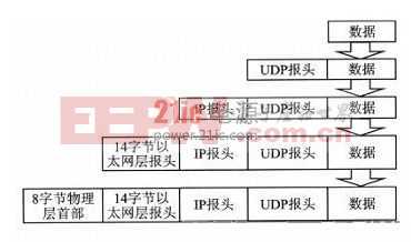 處理器首先將從麥克風采樣的數(shù)據(jù)信號封裝成規(guī)定格式(其封裝步驟如圖6所示,封裝到14字節(jié)以太網(wǎng)層),然后把封裝好的數(shù)據(jù)交給DM 9000CEP驅動部分的發(fā)送函數(shù)dm_tran_packet(unsigned char*datas,intlength),通過設置TCR的發(fā)送請求位將數(shù)據(jù)發(fā)送出去,數(shù)據(jù)發(fā)送過程就是對數(shù)據(jù)打包的過程。而數(shù)據(jù)的接收是通過DM9000CEP的網(wǎng)絡中斷函數(shù)DM9000ISR()進行的,網(wǎng)卡每接到一個數(shù)據(jù)包將會產(chǎn)生一個中斷,進入中斷處理函數(shù),按規(guī)定的格式從數(shù)據(jù)包中取出其語音數(shù)據(jù),之后數(shù)據(jù)經(jīng)處理器處理送到揚聲器上播放外音。網(wǎng)絡各層數(shù)據(jù)封裝如圖6所示。