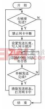 語音數(shù)據(jù)進行封裝之后,不管是發(fā)送數(shù)據(jù)幀還是接收數(shù)據(jù)幀,都需要底層網(wǎng)卡驅動函數(shù)提供服務,本文以發(fā)送數(shù)據(jù)幀為例,簡述底層網(wǎng)卡驅動原理,在發(fā)送數(shù)據(jù)和接收數(shù)據(jù)過程中,特別需要注意的是關閉網(wǎng)卡中斷,以防打斷數(shù)據(jù)處理過程。DM9000CEP內(nèi)部有3 KB的SRAM用于發(fā)送數(shù)據(jù)緩存。在發(fā)送之前,數(shù)據(jù)是暫存在這個SRAM中的。當需要連續(xù)發(fā)送時,需要用DM9000CEP寄存器MWCMD賦予數(shù)據(jù)端口,這樣就指定了SRAM中的某個地址,并且在傳輸完一個數(shù)據(jù)后,指針會指向SRAM中的下一個地址,從而達到連續(xù)訪問數(shù)據(jù)的目的。如果在此過程中到達發(fā)送數(shù)據(jù)緩沖區(qū)末尾,指針將折回緩沖區(qū)的開頭。發(fā)送數(shù)據(jù)幀的流程圖如圖7所示。