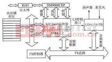 系統(tǒng)采用S3C2440微處理器實現(xiàn)數(shù)據(jù)處理,利用DM9000CEP以太網(wǎng)控制芯片來實現(xiàn)與IP網(wǎng)交互,并且采用UDA1341TS音頻芯片進行語音采集及播放。其他接口電路比較常見,這里不再贅述。