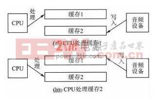 本設計需要實現(xiàn)全雙工語音通信功能,本終端采用雙緩存的設計方法,緩存處理機制以錄音為例,系統(tǒng)在使用緩存2來存放音頻設備量化好的數(shù)據(jù)時,CPU則處理緩存1的數(shù)據(jù),當設備填充完緩存2,則轉向緩存1進行填充,此時CPU處理緩存2的數(shù)據(jù),如此不斷循環(huán)交替,其處理過程如圖4所示。
