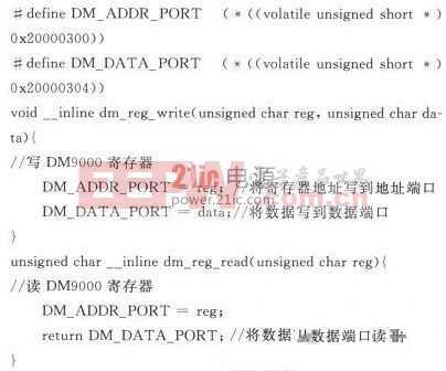 DM9000CEP芯片的初始化設置工作方式:通過CMD與ADDR2引腳相連,高電平時為數(shù)據(jù)端口,低電平時為地址端口。CS與NGCS4引腳相連,選擇DM9000CEP的端口基址為0x2000 0000,偏移300個單位。發(fā)送給DM9000的地址信息固定放在0x2000 0300上,把存放在該地址的數(shù)據(jù)放在0x2000 0304,采用此方式可對DM9000CEP內(nèi)部的寄存器進行操作,如啟動、復位、TX控制、RX控制以及MAC地址初始化等。其代碼如下: