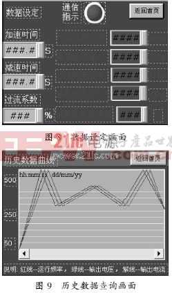 圖9 為運行頻率,是輸出電壓及輸出電流的歷史運行數(shù)據(jù)查詢畫面。