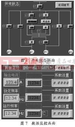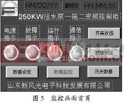 圖5 為人機界面監(jiān)控畫面首頁,能顯示各種狀態(tài)指示,從此畫面點擊相應的按鈕可以進入其它五個監(jiān)控畫面。在此界面中,主要參數(shù)的監(jiān)控畫面用紅色文字標識。