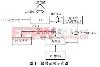 本系統(tǒng)主要組成部分為PLC、人機界面、變頻器、軟啟動器、PID控制及一系列開關(guān)控制元件。