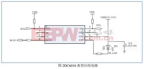 DC6010的典型應用電路簡單可靠,芯片外圍電路只需接一個紅外二極管D1,一個電容,四個電阻。