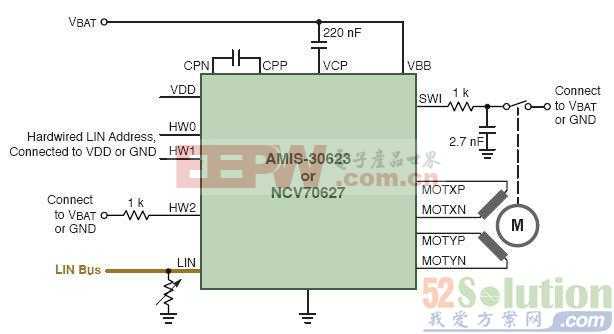 AMIS-30623單芯片微步進電機驅動器控制器及LIN接口可用于設計與LIN主機遠程連接的專用機電方案。該器件通過總線接收位置指令,并使用可配置的電流、速度、加速度及減速度參數(shù),驅動電機線圈至所需的位置,還可檢測電機停轉狀況,適用于前照燈水平調整和旋轉控制。