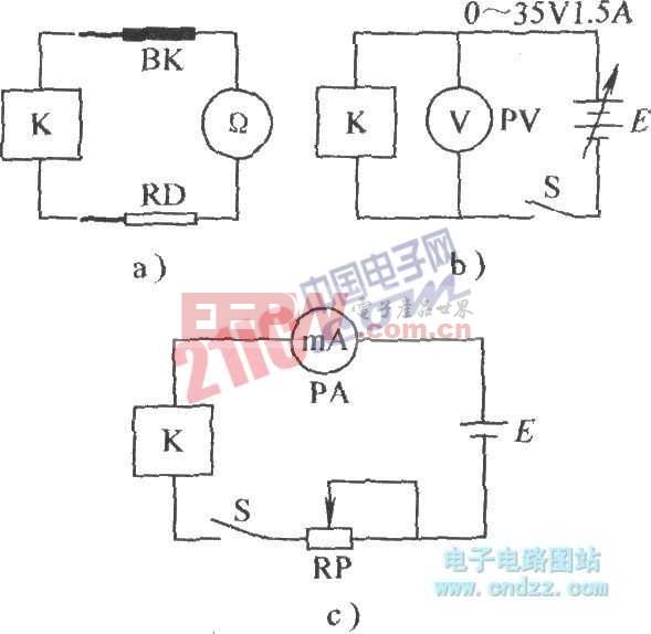 圖a為測(cè)量線圈的電阻.萬(wàn)用表選擇R×100Ω檔.圖b為測(cè)定繼電器吸合電壓和釋放電壓.調(diào)節(jié)穩(wěn)壓電源使之從0V逐漸上升。當(dāng)剛聽(tīng)到銜鐵“嗒”一聲吸合時(shí),此時(shí)電壓表PV指示的電壓值便是吸合電壓;然后再調(diào)動(dòng)穩(wěn)壓器調(diào)壓旋鈕,使電壓逐漸下降,當(dāng)聽(tīng)到原先吸合的銜鐵"咔"一聲釋放了,此時(shí)的電壓就是該繼電器的釋放電壓.圖c為測(cè)定繼電器的吸合電流和釋放電流.方法與圖b類(lèi)似.