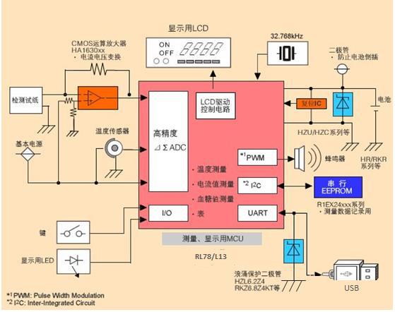 圖1:采用瑞薩的RL78/L13設(shè)計出的血糖監(jiān)視儀的系統(tǒng)框圖