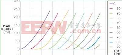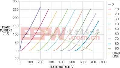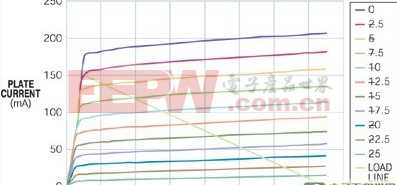 圖2 五極管的負載曲線表明,陽極可在陽極電壓僅為50V時吸收150 mA電流