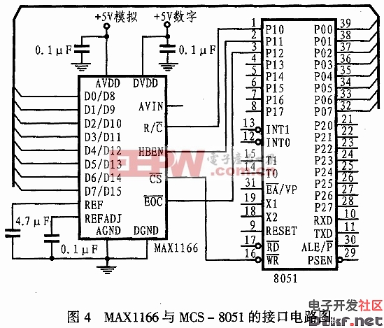 MAX1166的總線接口為8位,該總線的接口速度相當快,可以和各種微處理器直接進行接口,因此MAX1166與8位微處理器的連接電路相對比較簡單。圖4是MAX1166和MCS-8051的接口電路圖。在本例中,由于單片機外圍芯片僅有MAX1166一片,所以,為簡單起見,沒有為之確定地址,即任意地址均可作為其地址。因為MAX1166的CS信號脈沖寬度要求最小為40ns,因此,對于單片機而言,只要對外部設備進行寫操作,即會產(chǎn)生WR脈沖,其寬度為6個時鐘周期。如果采用12MHz的晶振,其脈沖寬度為500ns,所以可以將單片機的WR信號作為MAX1166的CS輸入信號。至于R/ C 、EOC和HBEN等信號,只需連接到普通的鎖存功能端口即可(如單片機的P1口)。