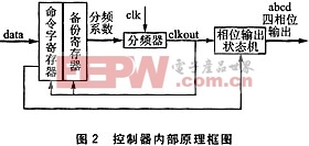 控制器的內(nèi)部原理框圖如圖2所示,由命令字寄存器(Cmd_reg)、分頻系數(shù)備份寄存器(fdiv_back)、分頻器、相位輸出狀態(tài)機(jī)組成。