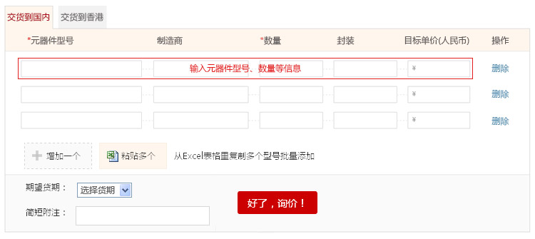 第二、復(fù)制粘貼華秋商城里為便捷用戶的詢價(jià)需求,只需復(fù)制Excel里的產(chǎn)品型號和數(shù)量并粘貼到此版塊中,系統(tǒng)會(huì)自動(dòng)轉(zhuǎn)化成頁面形式,用戶可再次調(diào)整產(chǎn)品和數(shù)量及其他要求,提交詢價(jià)單。如下圖所示
