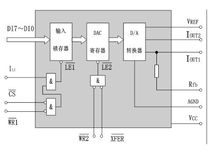 * WR2:DAC寄存器選通輸入線,負(fù)脈沖(脈寬應(yīng)大于500ns)有效。由WR2、XFER的邏輯組合產(chǎn)生LE2,當(dāng)LE2為高電平時(shí),DAC寄存器的輸出隨寄存器的輸入而變化,LE2的負(fù)跳變時(shí)將數(shù)據(jù)鎖存器的內(nèi)容打入DAC寄存器并開(kāi)始D/A轉(zhuǎn)換。