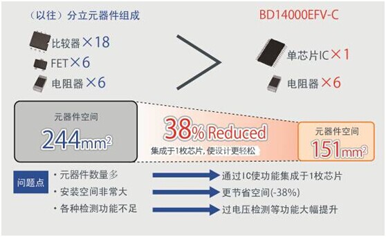 在多年積累的ROHM模擬設(shè)計(jì)技術(shù)的基礎(chǔ)上,由日本貴彌功株式會(huì)社提供確定規(guī)格、樣品評(píng)估等方面的支持,使以往由20個(gè)以上分立元器件完成的EDLC電池平衡功能僅通過(guò)1枚芯片即可實(shí)現(xiàn),這實(shí)屬業(yè)界首創(chuàng)※。元器件安裝空間可縮減約38%。