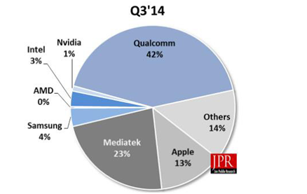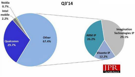 全球?qū)τ谛袆?dòng)裝置的需求仍然火熱。日前,研究機(jī)構(gòu)JonPeddieResearch(JPR)公布2014Q3行動(dòng)裝置內(nèi)的SoC,以及GPUIP占有率的市場報(bào)告。