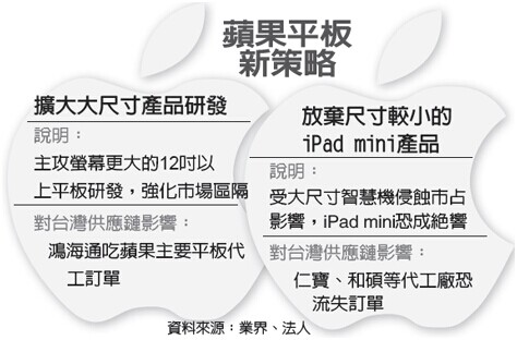 市場(chǎng)傳出,蘋(píng)果明年平板策略將大轉(zhuǎn)彎,不再推出7.9寸 的 ipadmini系列產(chǎn)品,集中火力拱12寸以上的新款大平板,最快明年3月問(wèn)世,全數(shù)由鴻海代工,原本靠代工ipadmini,成為蘋(píng)果供應(yīng)鏈的仁寶、和碩恐痛失訂單。