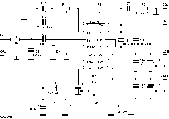 TDA7293內(nèi)部結(jié)構(gòu)分為三級:差分輸入級由雙極型晶體管組成,推動級和功率輸出級采用場效應(yīng)管,這種結(jié)構(gòu)可以綜合雙極型晶體管低噪音和功率場效應(yīng)管在線性、溫度系數(shù)、音色上的優(yōu)勢。音色優(yōu)美,兼顧了雙極信號處理電路和MOS功率管的優(yōu)點,具有低失真、低噪音、高耐壓以及開關(guān)機靜音、過熱保護、短路保護等優(yōu)點。