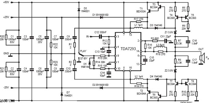 TDA7293是15腳封裝。TDA7293各腳的作用如下:1腳是待機地;2腳是反相輸人端;3腳是正相輸人端;4腳是地;5腳是短路電流檢測端,通常作為懸空;6腳是自舉端;7腳是正電源輸入端(信號處理部分);8腳是負電源輸入端(信號處理部分);9腳是待機端;10腳是靜音端;11是緩沖驅(qū)動輸出端(橋接時使用);12腳是反饋輸人端;13腳是正電源輸人端(功率輸出級部分);14腳是功率輸出端;15腳是負電源輸入端(功率輸出級部分)。