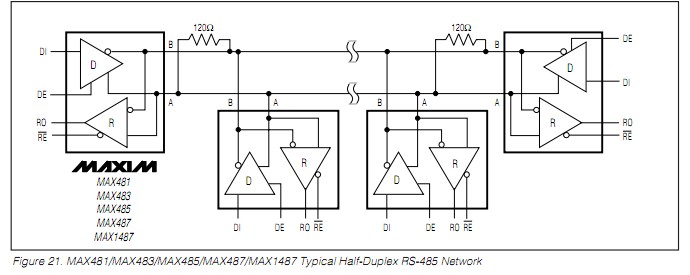 MAX485在網(wǎng)絡(luò)(多個節(jié)點)下的應(yīng)用請看下圖